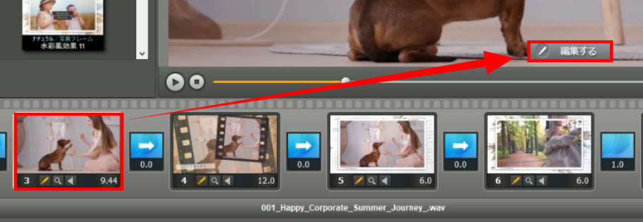 クロップ編集したいシーンをクリックして、プレビュー画面下の「編集する」をクリックします。