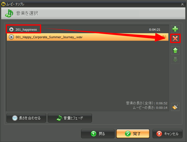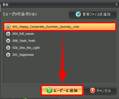 追加するBGMを選択して、「ムービーに追加」をクリックします。