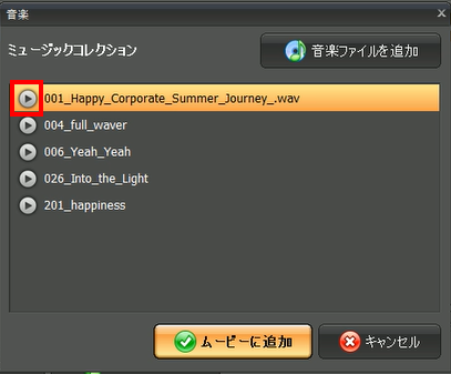 ミュージックコレクションの音楽をプレビュー再生するには、再生マークをクリックします。