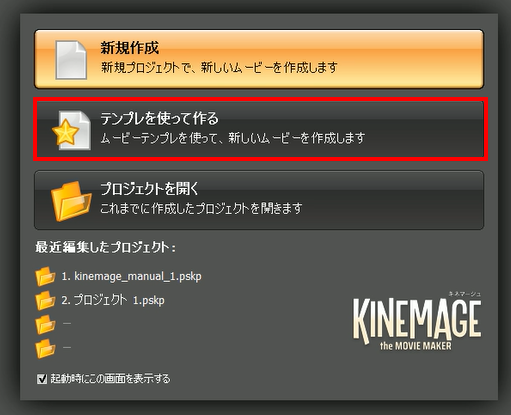 製品が起動したら「テンプレを使って作る」をクリックします。