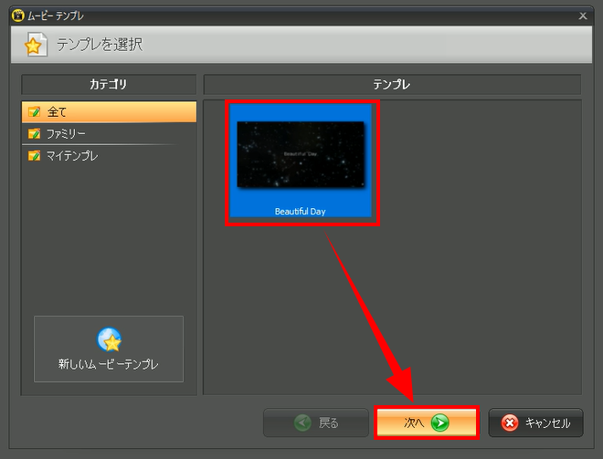 「ファイル」メニューの「ムービーテンプレから作成」からもムービーテンプレを使って、作品を作ることができます。