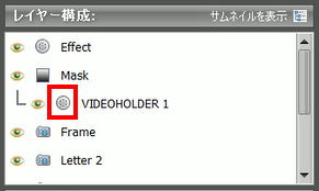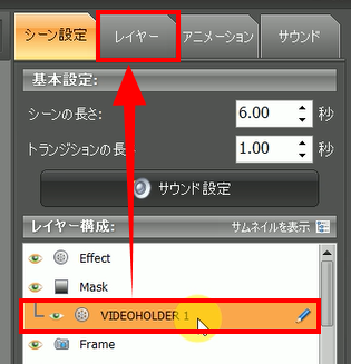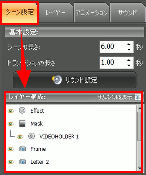 「シーン設定」タブ内の「レイヤー構成」内でシーンの要素が確認できます。