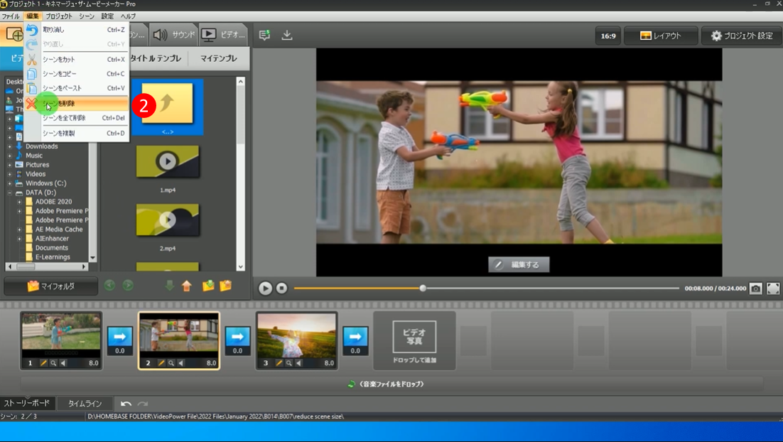 1)シーンを選択して削除します, ② メニューの編集/シーンを削除をクリックします