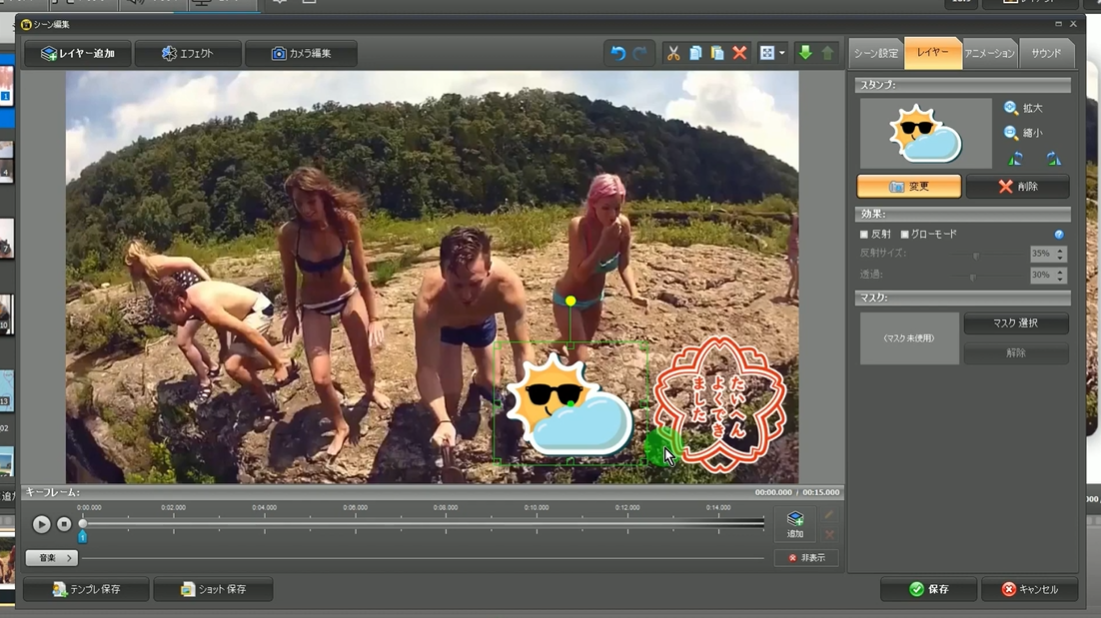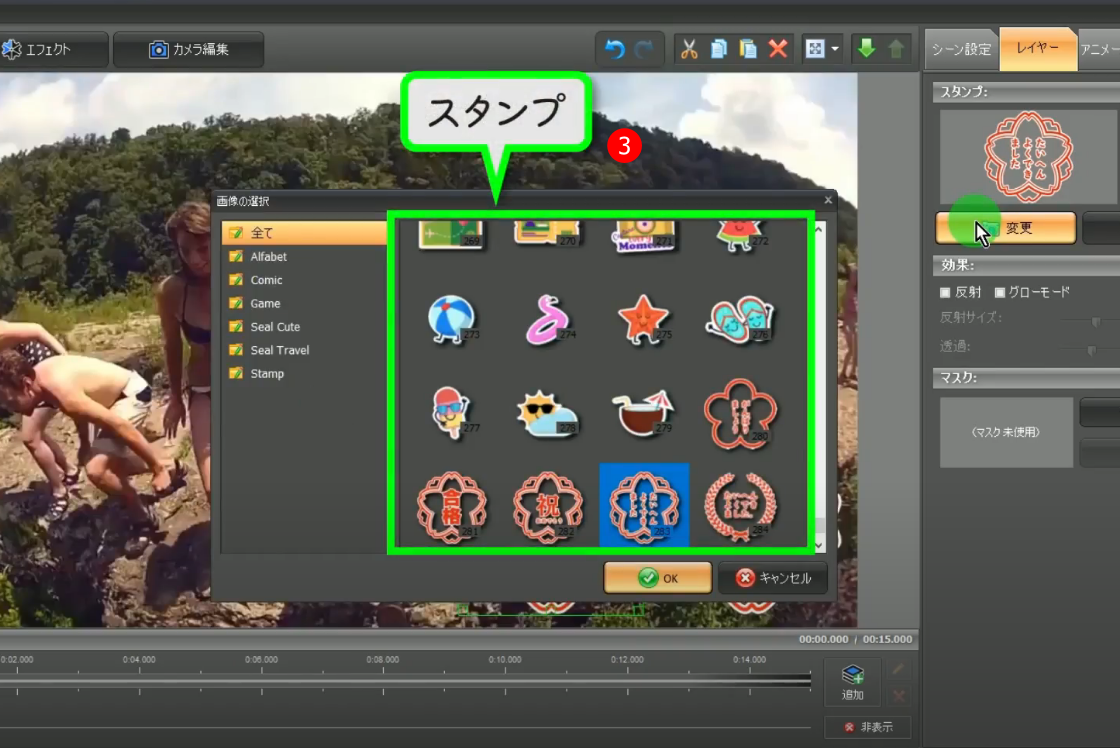 キネマージュ・ムービーメーカーなら、貼ってあるスタンプの交換も簡単です。