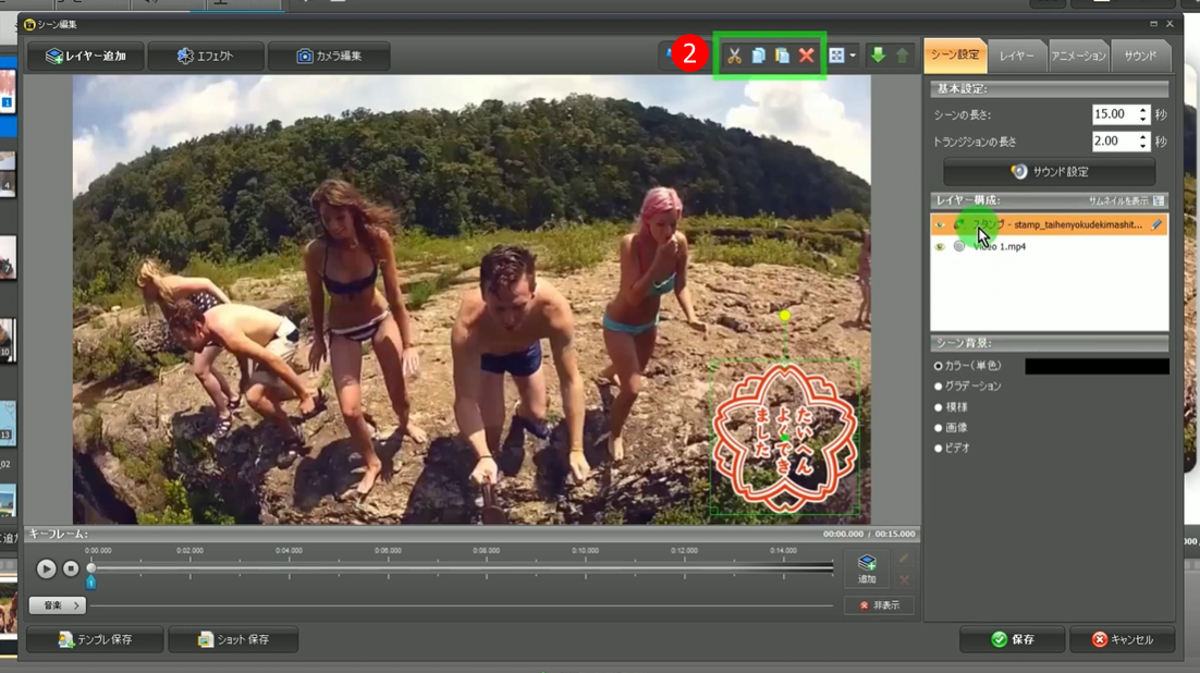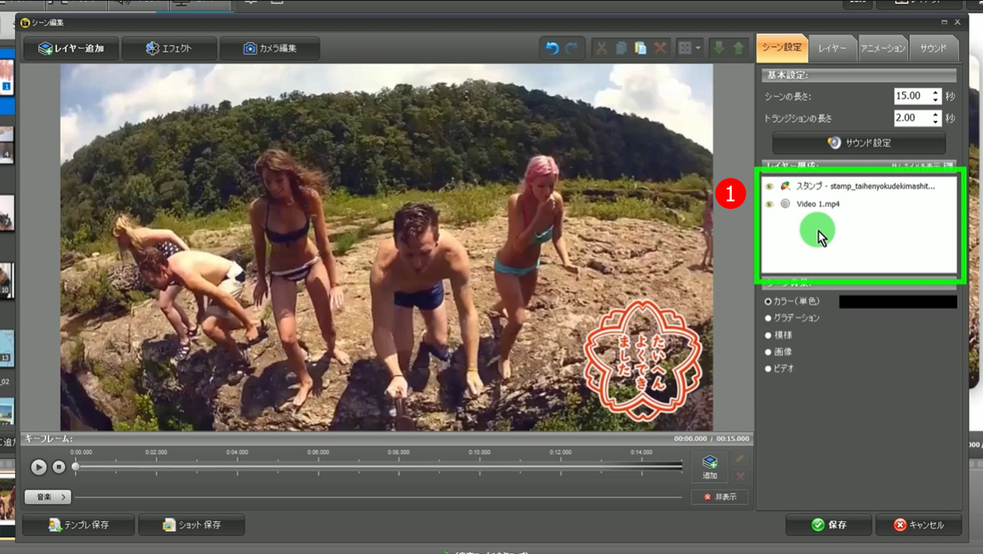 ① シーン編集画面のシーン設定タブの、「レイヤー構成」から配置済みのスタンプを選択します。