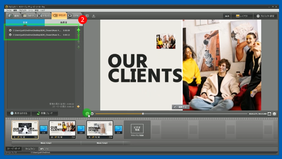 ストーリーボードで、BGMの順番を入れ替える方法、サウンドタブで設定されている音楽を確認できます