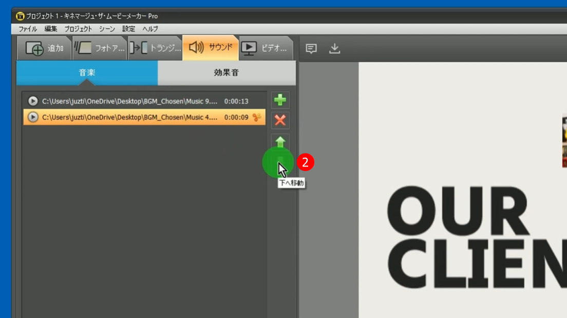 ストーリーボードで、BGMの順番を入れ替える方法、サウンドタブ内で音楽の順番を変更できます