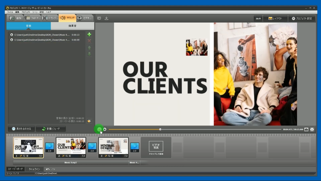 キネマージュ・ムービーメーカーでは、複数のBGMを設定することができ、