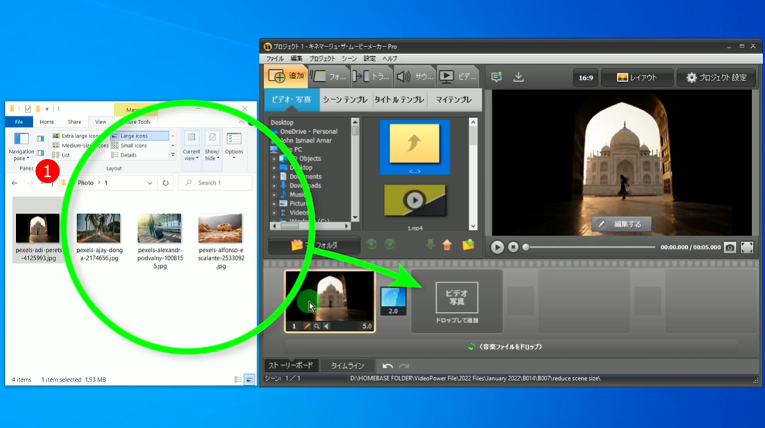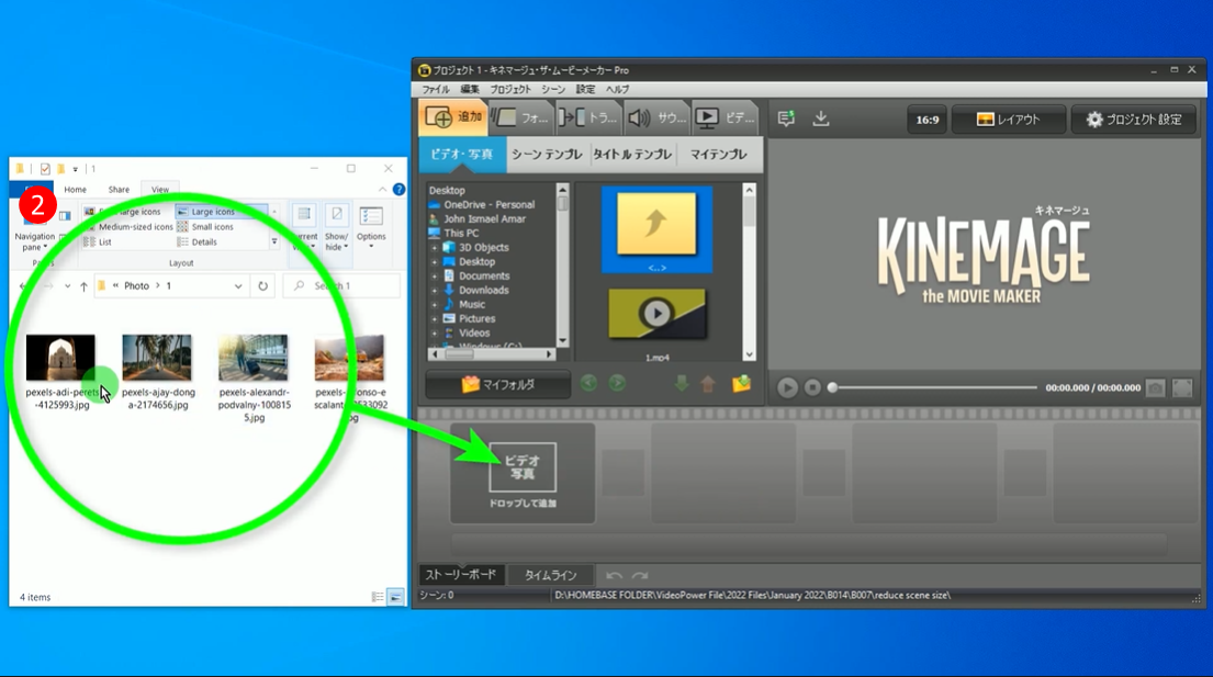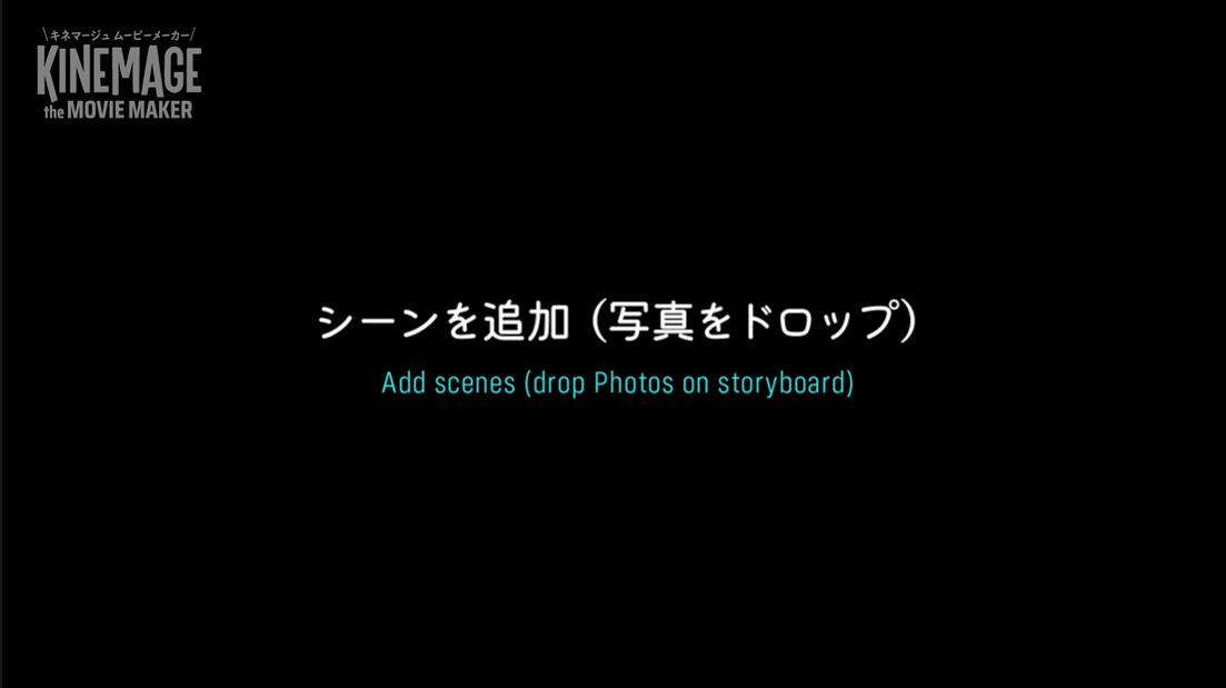 キネマージュ・ムービーメーカーは、シーンを自由に、簡単に追加することができます。 このガイドでは、ストーリーボードに写真ファイルをドロップして、シーンを追加する手順をご案内します。