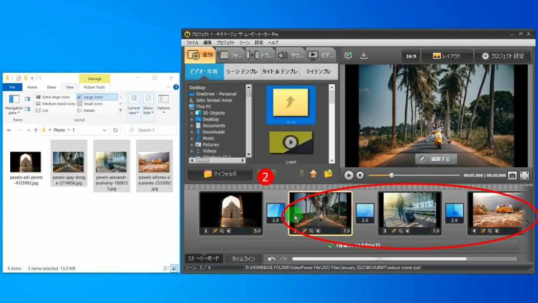 (1) シーンに使う写真を保存しているフォルダを、Windowsのファイルエクスプローラで開きます。