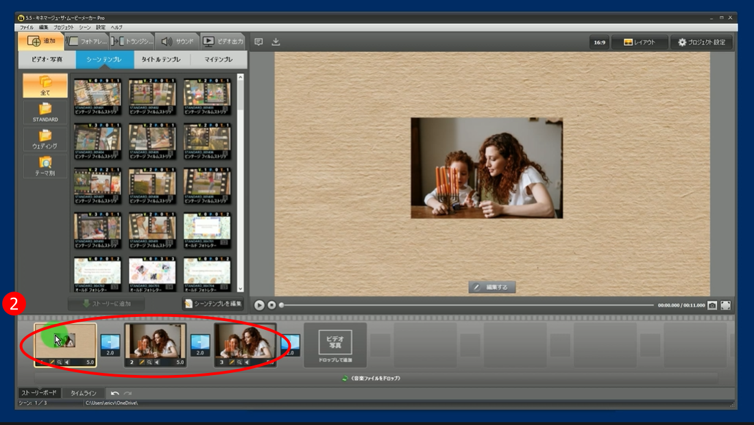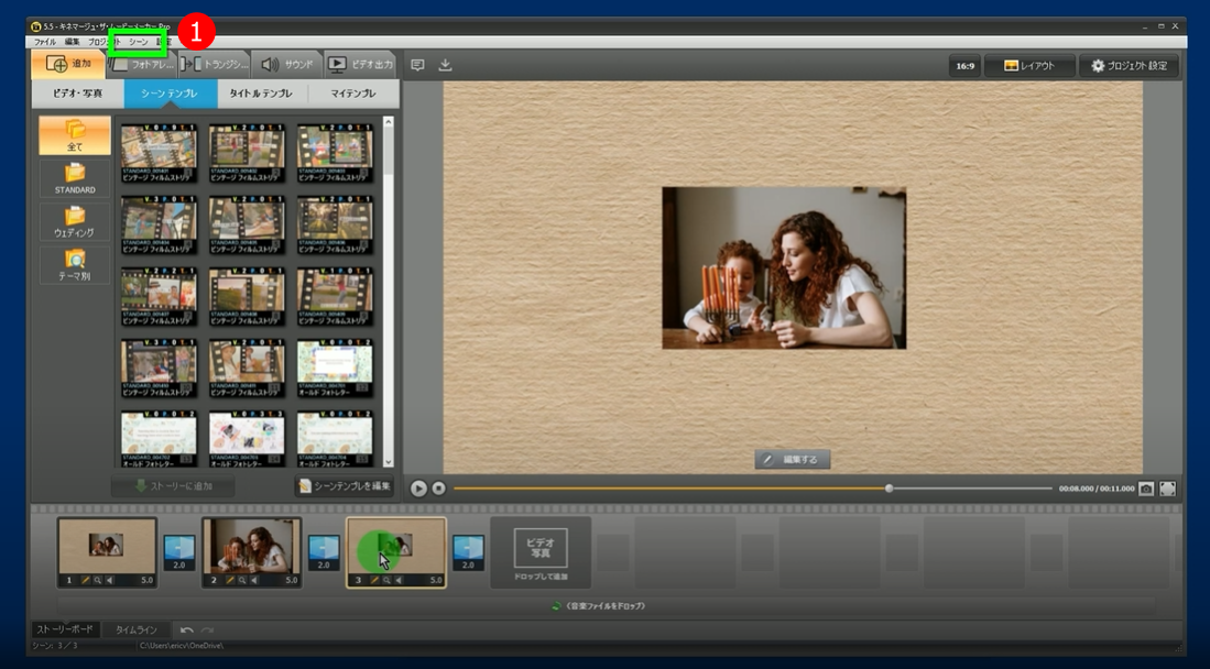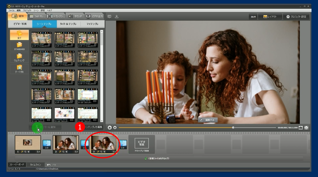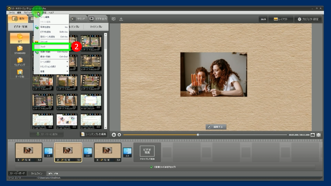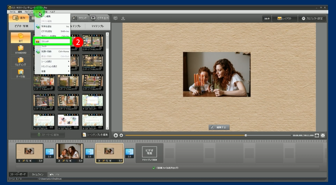 ビデオエディターを使って、必要に応じて映像のシーンをフィットとストレッチ(メニュー)させたりすることができます。「キネマージュ・ムービーメーカー」は、フィッティングやストレッチのシーンを素早く簡単に行うことができます。