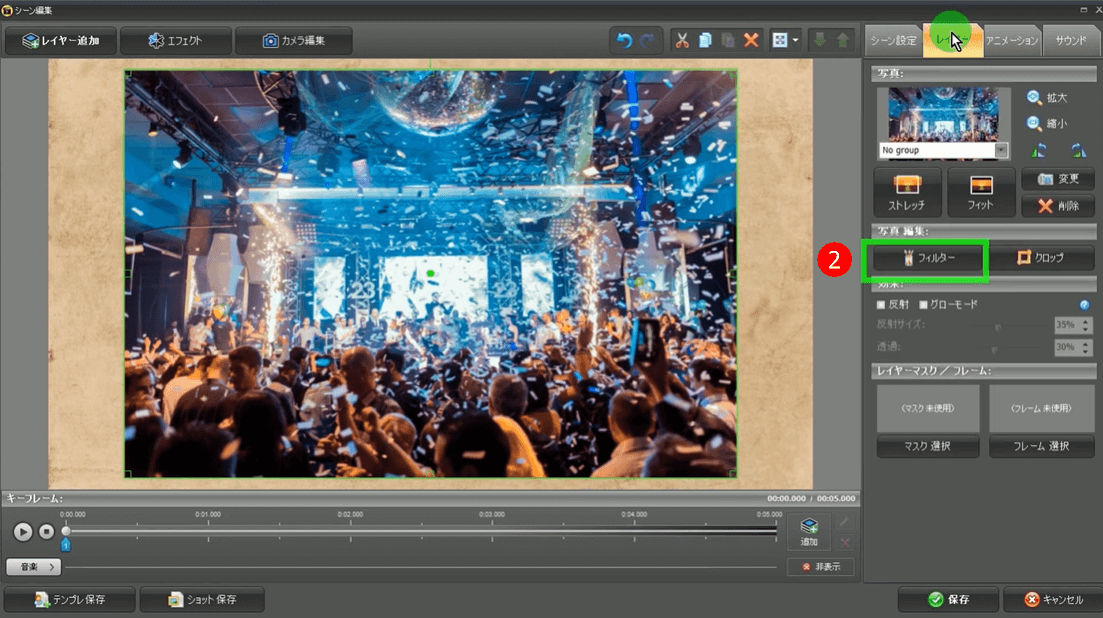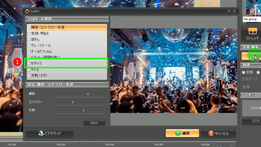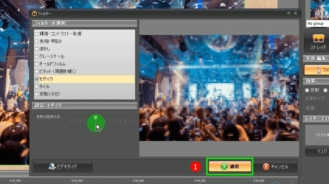 「キネマージュ・ムービーメーカー」のフィルターを使うのはとても簡単です。ここでは、モザイク効果を使うことができます。素早く画像にモザイクをかけたいときに、最適なツールです。