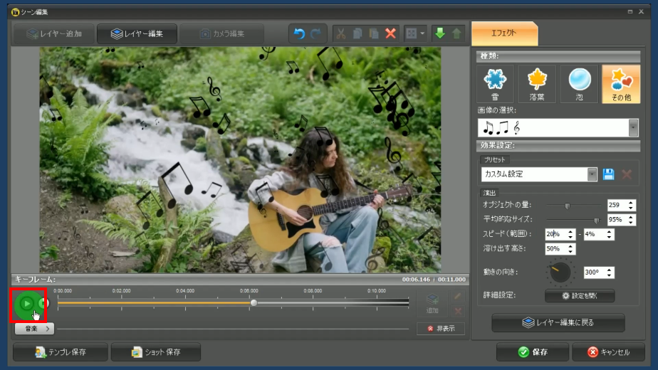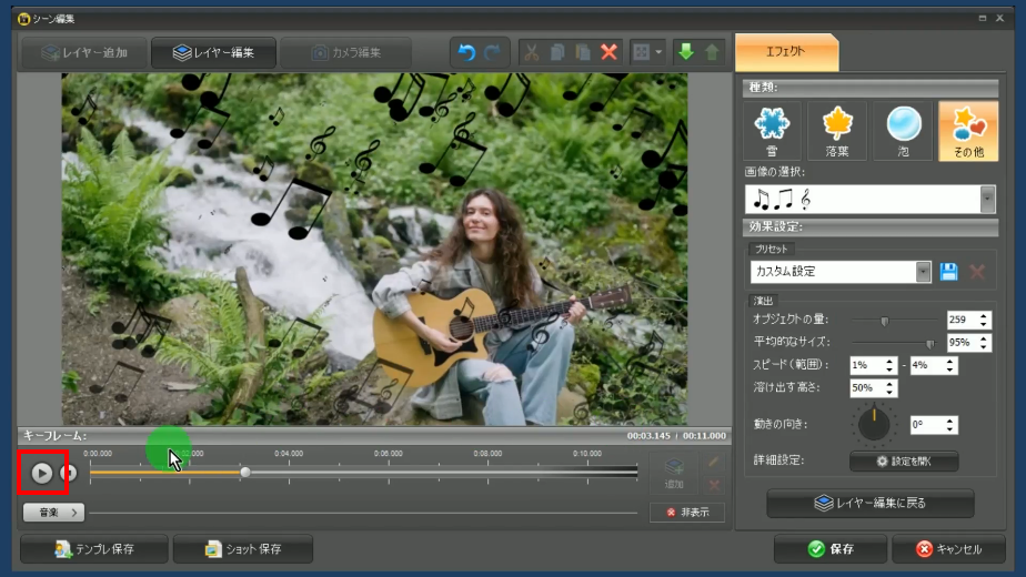 キネマージュ・ムービーメーカーのエフェクト機能は、映像に、簡単に雪や落ち葉、舞い上がるハートなどを追加することができます。
