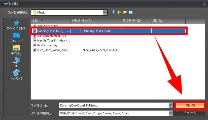 音楽ファイルを選択して、「開く」をクリックします。
